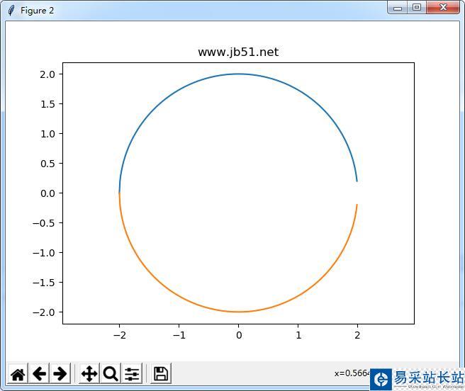 # -*- coding:utf-8 -*-#! python3import numpy as npimport matplotlib.pyplot as plt# ==========================================# 圓的基本信息# 1.圓半徑r = 2.0# 2.圓心坐標a, b = (0., 0.)# ==========================================# 方法一:參數(shù)方程theta = np.arange(0, 2*np.pi, 0.01)x = a + r * np.cos(theta)y = b + r * np.sin(theta)fig = plt.figure() axes = fig.add_subplot(111) axes.plot(x, y)axes.axis('equal')plt.title('www.jb51.net')# ==========================================# 方法二:標準方程x = np.arange(a-r, a+r, 0.01)y = b + np.sqrt(r**2 - (x - a)**2)fig = plt.figure() axes = fig.add_subplot(111) axes.plot(x, y) # 上半部axes.plot(x, -y) # 下半部plt.axis('equal')plt.title('www.jb51.net')# ==========================================plt.show()運行效果: