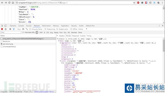 這個接口通過傳遞關鍵字,其返回的是一段json數據,數據包含音樂名稱、歌手、專輯、總數據量等信息,當然最重要的是數據包含音樂各個品質的hash。