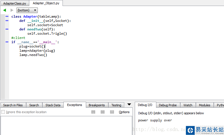 #理解 #就是電源適配器的原理吧,將本來不兼容的接口類能夠工作 #這個是類實現方式 #例子 #假如一個插座類輸出腳是3腳的,而臺燈需要的是兩腳插座,現在就需要一個Adapter實現適配插座 #Adaptee class socket(object): def Trigle(self): print 'power supply' #target class tableLamp(object): def needTwo(self): pass #adapter class Adapter(tableLamp,socket): def needTwo(self): self.Trigle() #client if __name__=='__main__': lamp=Adapter() lamp.needTwo()