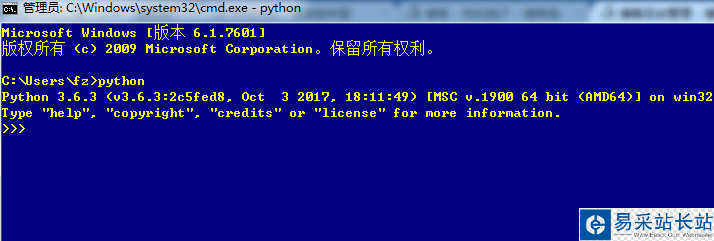 安裝完成后,打開命令提示行,輸入python,若出現(xiàn)如下“>>>”,證明安裝成功: