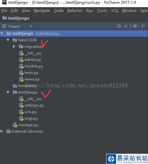 可以看到,在項目根目錄下,有三個文件夾:fakeCSDN, templates和testDjango,以及一個python腳本文件manage.py.