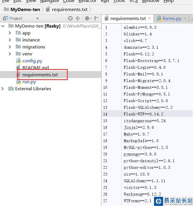 即可在項目根目錄下看見一個requirements.txt文件,文件中顯示出本項目所有配置依賴包信息。具體見下圖: