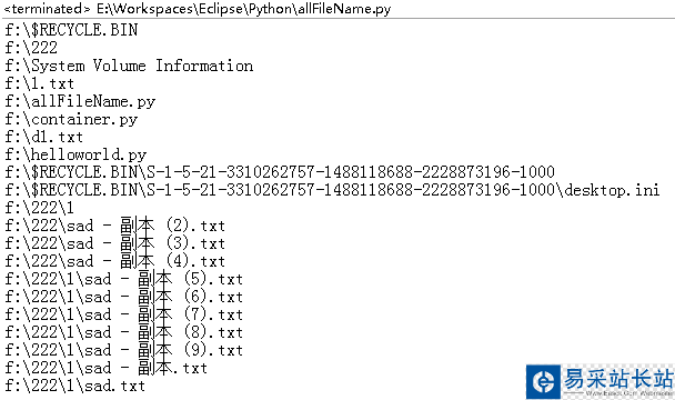 # -*-coding:utf-8-*- import os; files = list(); def DirAll(pathName): if os.path.exists(pathName): fileList = os.listdir(pathName); for f in fileList: if f=="$RECYCLE.BIN" or f=="System Volume Information": continue; f=os.path.join(pathName,f); if os.path.isdir(f): DirAll(f); else: dirName=os.path.dirname(f); baseName=os.path.basename(f); if dirName.endswith(os.sep): files.append(dirName+baseName); else: files.append(dirName+os.sep+baseName); DirAll("f://"); for f in files: print f.decode('gbk').encode('utf-8'); 運行效果如下: