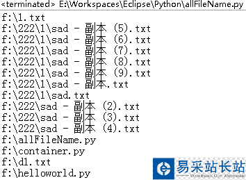# -*-coding:utf-8-*- import os for root,dirs,files in os.walk("f://"): for dir in dirs: print os.path.join(root,dir).decode('gbk').encode('utf-8'); for file in files: print os.path.join(root,file).decode('gbk').encode('utf-8'); 運行效果如下: