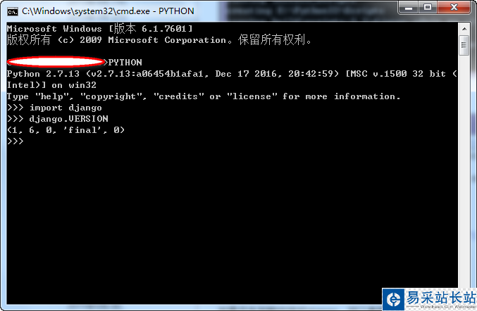 在Windows終端命令行輸入python進入Python環境,輸入import Django->再輸入django.VERSION