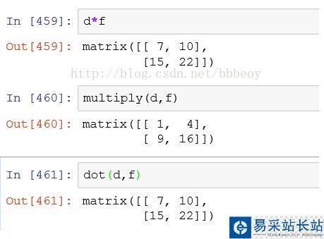 總結:數組乘法默認的是點乘,矩陣默認的是矩陣乘法,混合在一起默認的是矩陣乘法,multiply轉化為對應元素的乘積,dot(d,f)會轉化為矩陣的乘積,注意,像multiply不滿足對應元素時,按照廣播是方式進行。