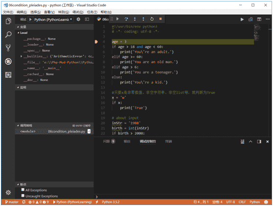 這里需要提醒一下的是,左上角的下拉選擇調試模式中,常用的兩個是Python和Integrated Terminal/Console,第一個就是在插件自帶的環境中調試運行,第二個就是集成的控制臺中。問題是,第一種暫不支持input()輸入,所以想調試帶input的程序,就選擇Integrated Terminal/Console或者External Terminal/Console也是可以的。