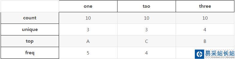 import pandas as pda={'one':['A','A','B','C','C','A','B','B','A','A'], 'tao':['B','B','C','C','A','A','C','B','C','A'], 'three':['C','B','A','A','B','B','B','A','C','D']}b=pd.DataFrame(a)b.describe()b是轉(zhuǎn)換后DataFrame,顯示如表格: