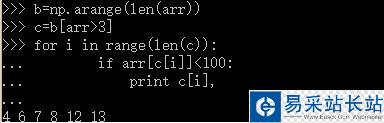 c=b[arr>3]#c存放的就是arr中大于3的元素對(duì)應(yīng)的索引 #最后通過遍歷c數(shù)組,選擇3到100之間的值打印出來 for i in range(len(c)): if arr[c[i]]<100: print c[i],