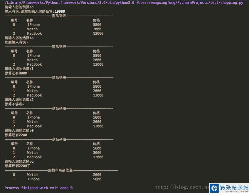 #!/usr/bin/env python# -*- coding: utf-8 -*-"""@author: 烽火@license: Apache Licence@file: shopping.py@time: 6/16/17 10:05 AM"""goods = [ ("IPhone", 5800), ("Watch", 2000), ("MacBook", 12000)]goods_cart = []mybudget = input("請輸入您的預算:")# 不考慮是小數的情況while not mybudget.isdigit(): mybudget = input("輸入有誤,請重新輸入您的預算:")mybudget = int(mybudget);while True: print("商品列表".center(50, "-")) print("編號".center(8, " "), "名稱".ljust(30, " "), "價格".ljust(10, " ")) for i in enumerate(goods): print(str(i[0]).center(10, " "), str(i[1][0]).ljust(31, " "), str(i[1][1]).ljust(10, " ")) user_choose = input("請輸入您的選擇:") if user_choose.isdigit(): user_choose = int(user_choose) if user_choose >= 0 and user_choose < len(goods): if (mybudget - goods[user_choose][1]) >= 0: goods_cart.append(goods[user_choose]) mybudget -= goods[user_choose][1] print("預算還有%d" % mybudget) else: print("預算不夠啦~") else: print("不存在該商品~") elif user_choose == 'q': break else: print("您的輸入有誤~")print("預算還剩%d了" %(mybudget))print("購物車商品信息".center(50, "-"))for i in enumerate(goods_cart): print(str(i[0]).center(10, " "), str(i[1][0]).ljust(31, " "), str(i[1][1]).ljust(10, " "))運行結果