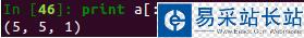 這里應該是大家最疑惑的地方了,為什么列的參數改成None,輸出的shape都變了,這里大家要知道,None代表新增加一個維度,它有一個別稱叫newaxis,大家可以輸出一下numpy.newaxis就知道了,那么這個別稱應該顧名思義了吧。那么為什么是5x1x5,而不是5x5x1呢,那是因為你在第二維上用了None,你如果在第三維上用就會變成5x5x1了,不信你看