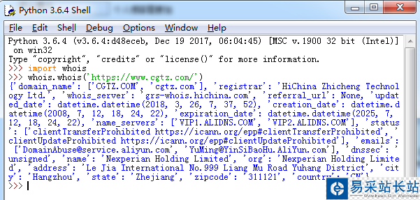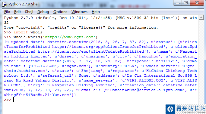 >>> import whois>>> whois.whois('https://www.cgtz.com/'){u'updated_date': datetime.datetime(2018, 3, 26, 7, 37, 52), u'status': [u'clientTransferProhibited https://icann.org/epp#clientTransferProhibited', u'clientUpdateProhibited https://icann.org/epp#clientUpdateProhibited'], u'name': u'Nexperian Holding Limited', u'dnssec': u'unsigned', u'city': u'Hangzhou', u'expiration_date': datetime.datetime(2025, 7, 12, 18, 24, 22), u'zipcode': u'311121', u'domain_name': [u'CGTZ.COM', u'cgtz.com'], u'country': u'CN', u'whois_server': u'grs-whois.hichina.com', u'state': u'Zhejiang', u'registrar': u'HiChina Zhicheng Technology Ltd.', u'referral_url': None, u'address': u'Le Jia International No.999 Liang Mu Road Yuhang District', u'name_servers': [u'VIP1.ALIDNS.COM', u'VIP2.ALIDNS.COM'], u'org': u'Nexperian Holding Limited', u'creation_date': datetime.datetime(2008, 7, 12, 18, 24, 22), u'emails': [u'DomainAbuse@service.aliyun.com', u'YuMing@YinSiBaoHu.AliYun.com']}>>>補充:Python2運行結果截圖如下: