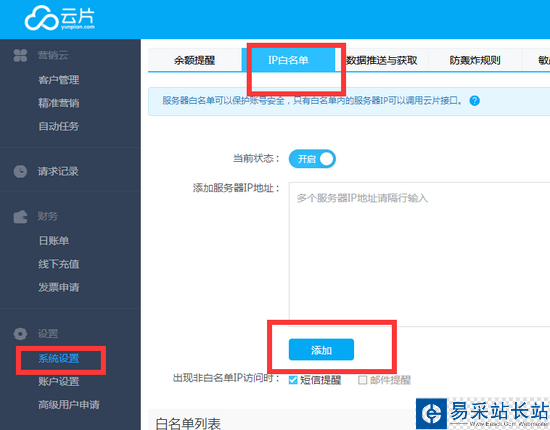 4.在云片網(wǎng)后臺設(shè)置ip白名單,將外網(wǎng)ip加入白名單