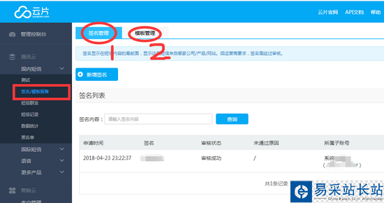 3.等待認(rèn)證完成的短信通知,然后按照后臺的操作指引,在【簽名管理】頁【新增簽名】,在【模板管理】頁【新增模板】,這些都要等待云片網(wǎng)的審核,審核通過會有短信通知。