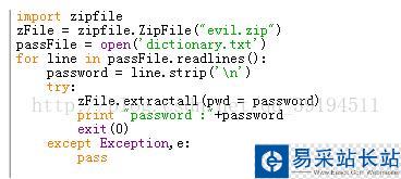 我們可以用拋出的異常測試我們的字典文件,在這里為了簡便直接新建了一個“dictionary.txt”文件,其中有zip文件的密碼,我們需要遍歷字典中的每個單詞。如果extractall執行成功則輸出密碼,否則拋出異常,忽略這個異常,再測試下一個密碼。