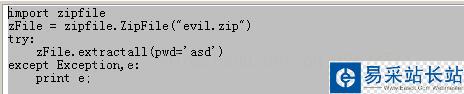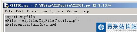讓我們來寫一個腳本測試一下Zip文件庫的用法,首先創建一個有密碼的壓縮文件,這里設置密碼為awd,文件名為evil.zip,要解壓這個zip文件,實例化一個新的ZipFile類,使用extractall()方法,在可選參數pwd上填上密碼