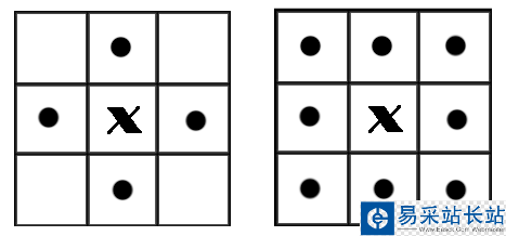 在二值圖像中,如果兩個(gè)像素點(diǎn)相鄰且值相同(同為0或同為1),那么就認(rèn)為這兩個(gè)像素點(diǎn)在一個(gè)相互連通的區(qū)域內(nèi)。而同一個(gè)連通區(qū)域的所有像素點(diǎn),都用同一個(gè)數(shù)值來(lái)進(jìn)行標(biāo)記,這個(gè)過(guò)程就叫連通區(qū)域標(biāo)記。在判斷兩個(gè)像素是否相鄰時(shí),我們通常采用4連通或8連通判斷。在圖像中,最小的單位是像素,每個(gè)像素周?chē)?個(gè)鄰接像素,常見(jiàn)的鄰接關(guān)系有2種:4鄰接與8鄰接。4鄰接一共4個(gè)點(diǎn),即上下左右,如下左圖所示。8鄰接的點(diǎn)一共有8個(gè),包括了對(duì)角線(xiàn)位置的點(diǎn),如下右圖所示。
