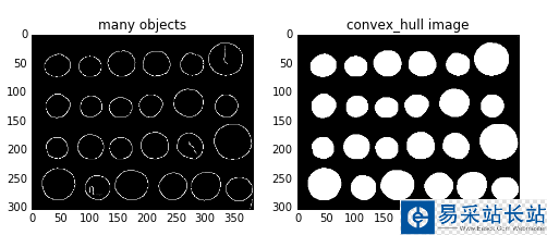 convex_hull_image()是將圖片中的所有目標(biāo)看作一個(gè)整體,因此計(jì)算出來(lái)只有一個(gè)最小凸多邊形。如果圖中有多個(gè)目標(biāo)物體,每一個(gè)物體需要計(jì)算一個(gè)最小凸多邊形,則需要使用convex_hull_object()函數(shù)。