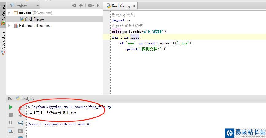 下面就是一個for循環(huán)非常簡單,然后就是做一個if判斷,如果文件名稱包括now而且文件名最后是.zip 如果能找到文件就打印:找到文件:文件名