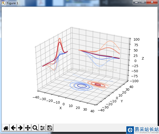 from mpl_toolkits.mplot3d import axes3d import matplotlib.pyplot as plt from matplotlib import cm fig = plt.figure() ax = fig.gca(projection='3d') X, Y, Z = axes3d.get_test_data(0.05) cset = ax.contour(X, Y, Z, zdir='z', offset=-100, cmap=cm.coolwarm) cset = ax.contour(X, Y, Z, zdir='x', offset=-40, cmap=cm.coolwarm) cset = ax.contour(X, Y, Z, zdir='y', offset=40, cmap=cm.coolwarm) ax.set_xlabel('X') ax.set_xlim(-40, 40) ax.set_ylabel('Y') ax.set_ylim(-40, 40) ax.set_zlabel('Z') ax.set_zlim(-100, 100) plt.show()繪制結(jié)果如下: