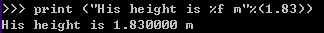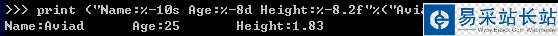 print ("Name:%-10s Age:%-8d Height:%-8.2f"%("Aviad",25,1.83))