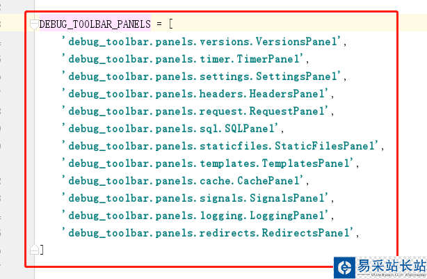 DEBUG_TOOLBAR_PANELS = [ 'debug_toolbar.panels.versions.VersionsPanel', 'debug_toolbar.panels.timer.TimerPanel', 'debug_toolbar.panels.settings.SettingsPanel', 'debug_toolbar.panels.headers.HeadersPanel', 'debug_toolbar.panels.request.RequestPanel', 'debug_toolbar.panels.sql.SQLPanel', 'debug_toolbar.panels.staticfiles.StaticFilesPanel', 'debug_toolbar.panels.templates.TemplatesPanel', 'debug_toolbar.panels.cache.CachePanel', 'debug_toolbar.panels.signals.SignalsPanel', 'debug_toolbar.panels.logging.LoggingPanel', 'debug_toolbar.panels.redirects.RedirectsPanel',]