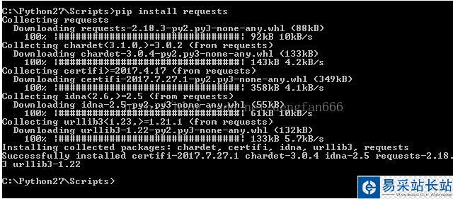 4. 接著再輸入命令pip install requests 執行安裝,等待他安裝完成就可以了。