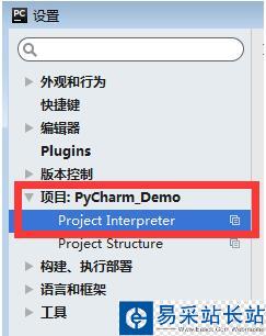 2. 選擇彈出界面左上角的“項目(Project): PyCharm_Demo”—>“project Interpreter”;