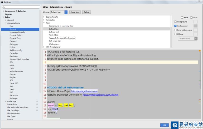 File——Settings——Editor——General——(右側(cè)上方的框框)Text——Default text——選右側(cè)的Background就可以設(shè)置背景色了。