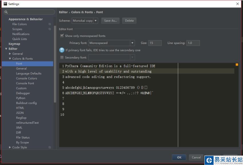 在font中scheme選擇monokai,但是并不能進行更改,比如字體大小,如果要進行進一步地調整,選擇save as,這樣就可以在這個新的備份上進行修改了