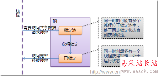 鎖有兩種狀態(tài)——鎖定和未鎖定。每當(dāng)一個線程比如"set"要訪問共享數(shù)據(jù)時,必須先獲得鎖定;如果已經(jīng)有別的線程比如"print"獲得鎖定了,那么就讓線程"set"暫停,也就是同步阻塞;等到線程"print"訪問完畢,釋放鎖以后,再讓線程"set"繼續(xù)。經(jīng)過這樣的處理,打印列表時要么全部輸出0,要么全部輸出1,不會再出現(xiàn)一半0一半1的尷尬場面。