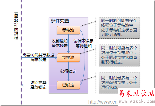 然而還有另外一種尷尬的情況:列表并不是一開始就有的;而是通過線程"create"創(chuàng)建的。如果"set"或者"print" 在"create"還沒有運行的時候就訪問列表,將會出現(xiàn)一個異常。使用鎖可以解決這個問題,但是"set"和"print"將需要一個無限循環(huán)——他們不知道"create"什么時候會運行,讓"create"在運行后通知"set"和"print"顯然是一個更好的解決方案。于是,引入了條件變量。