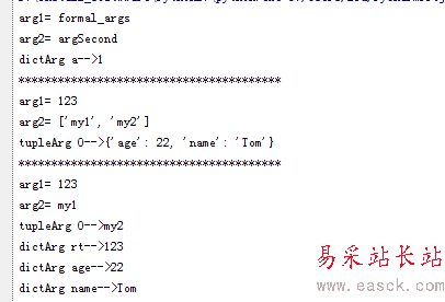 上面函數(shù)中的參數(shù),tupleArg前面“*”表示這個(gè)參數(shù)是一個(gè)元組參數(shù),從程序的輸出可以看出,默認(rèn)值為();dicrtArg前面有“**”表示這個(gè)字典參數(shù)(鍵值對(duì)參數(shù))。可以把tupleArg、dictArg看成兩個(gè)默認(rèn)參數(shù)。多余的非關(guān)鍵字參數(shù),函數(shù)調(diào)用時(shí)被放在元組參數(shù)tupleArg中;多余的關(guān)鍵字參數(shù),函數(shù)調(diào)用時(shí)被放字典參數(shù)dictArg中。