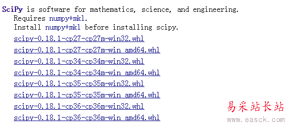 三、在文章開頭鏈接地址下載所需第三方庫(kù),以SciPy為例:0.18.1是庫(kù)版本號(hào);cp27、cp35分別對(duì)應(yīng)Python2.7、Python3.5;win32、win_amd64對(duì)應(yīng)操作系統(tǒng)是32位、64 位,下載時(shí)應(yīng)該根據(jù)自己電腦配置下載