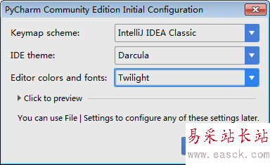 這里是選擇IDE編輯界面皮膚的,一般來說使用黑底灰字看起來沒那么刺眼,對眼好一點,這里選擇以后還可以在里面設置。