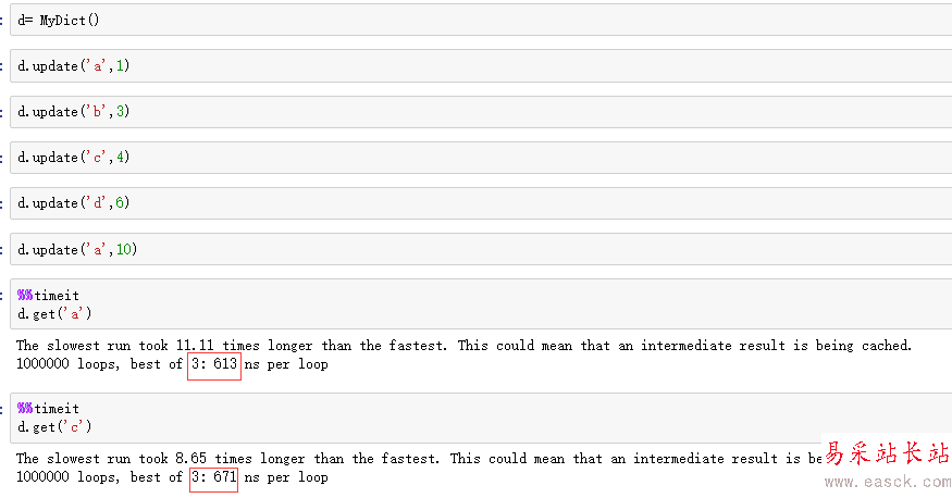 class MyDict: def __init__(self, num=100): # 指定列表大小 self._num = num self._lst = [] for _ in range(self._num): self._lst.append([]) def update(self, key, value): # 添加 key-value key_index = hash(key) % self._num for i, (k, v) in enumerate(self._lst[key_index]): if key == k: self._lst[key_index][i] = [key, value] break else: self._lst[key_index].append([key, value]) def get(self, key): # 根據指定的 key 彈出值 key_index = hash(key) % self._num for k, v in self._lst[key_index]: if k == key: return v else: raise KeyError('No such {} key'.format(key)) def pop(self, key): # 根據 key 彈出元素 并且刪除 key_index = hash(key) % self._num for i, (k, v) in enumerate(self._lst[key_index]): if k == key: result = v self._lst.pop(i) return result else: raise KeyError('No such {} key'.format(key)) def __getitem__(self, key): # 可以通過下標來取值 key_index = hash(key) % self._num for k, v in self._lst[key_index]: if k == key: return v else: raise KeyError('No such {} key'.format(key)) def keys(self): # 取得所有的key for index in range(self._num): for k, v in self._lst[index]: yield k def values(self): # 取得所有的 value for index in range(self._num): for k, v in self._lst[index]: yield v def items(self): # 取得所有的條目 for index in range(self._num): for item in self._lst[index]: yield item通過key查到的時間,可見下圖