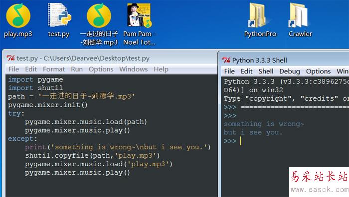 import pygameimport shutilpath = '一走過的日子-劉德華.mp3'pygame.mixer.init()try: pygame.mixer.music.load(path) pygame.mixer.music.play()except: print('something is wrong~/nbut i see you.') shutil.copyfile(path,'play.mp3') pygame.mixer.music.load('play.mp3') pygame.mixer.music.play()運行效果:
