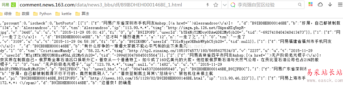 #coding=utf-8import urllib2import reimport jsonimport timeclass WY(): def __init__(self): self.headers = {'User-Agent': 'Mozilla/5.0 (Windows NT 5.1) AppleWebKit/534.24 (KHTML, like '} self.url='http://comment.news.163.com/data/news3_bbs/df/B9IBDHEH000146BE_1.html' def getpage(self,page): full_url='http://comment.news.163.com/cache/newlist/news3_bbs/B9IBDHEH000146BE_'+str(page)+'.html' return full_url def gethtml(self,page): try: req=urllib2.Request(page,None,self.headers) response = urllib2.urlopen(req) html = response.read() return html except urllib2.URLError,e: if hasattr(e,'reason'): print u"連接失敗",e.reason return None #處理字符串 def Process(self,data,page): if page == 1: data=data.replace('var replyData=','') else: data=data.replace('var newPostList=','') reg1=re.compile(" /[<a href=''>") data=reg1.sub(' ',data) reg2=re.compile('<////a>/]') data=reg2.sub('',data) reg3=re.compile('<br>') data=reg3.sub('',data) return data #解析json def dealJSON(self): with open("WY.txt","a") as file: file.write('ID'+'|'+'評論'+'|'+'踩'+'|'+'頂'+'/n') for i in range(1,12): if i == 1: data=self.gethtml(self.url) data=self.Process(data,i)[:-1] value=json.loads(data) file=open('WY.txt','a') for item in value['hotPosts']: try: file.write(item['1']['f'].encode('utf-8')+'|') file.write(item['1']['b'].encode('utf-8')+'|') file.write(item['1']['a'].encode('utf-8')+'|') file.write(item['1']['v'].encode('utf-8')+'/n') except: continue file.close() print '--正在采集%d/12--'%i time.sleep(5) else: page=self.getpage(i) data = self.gethtml(page) data = self.Process(data,i)[:-2] # print data value=json.loads(data) # print value file=open('WY.txt','a') for item in value['newPosts']: try: file.write(item['1']['f'].encode('utf-8')+'|') file.write(item['1']['b'].encode('utf-8')+'|') file.write(item['1']['a'].encode('utf-8')+'|') file.write(item['1']['v'].encode('utf-8')+'/n') except: continue file.close() print '--正在采集%d/12--'%i time.sleep(5)if __name__ == '__main__': WY().dealJSON()
