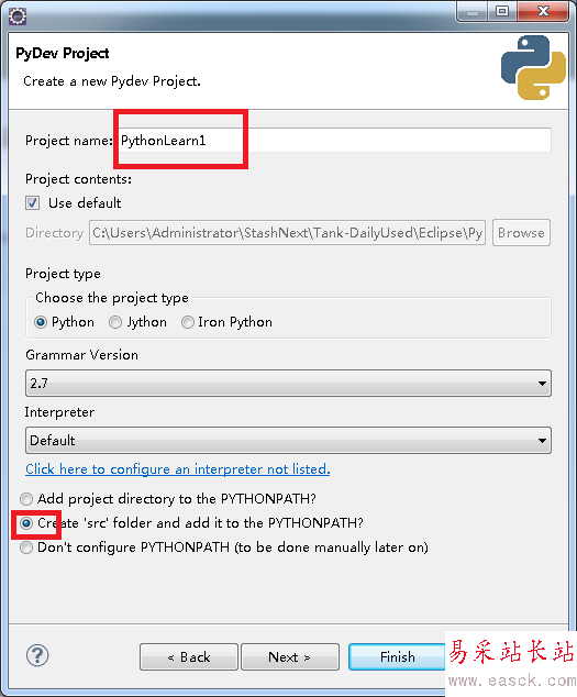 啟動Eclipse, 創建一個新的項目, File->New->Projects... 選擇PyDev->PyDevProject 輸入項目名稱.
