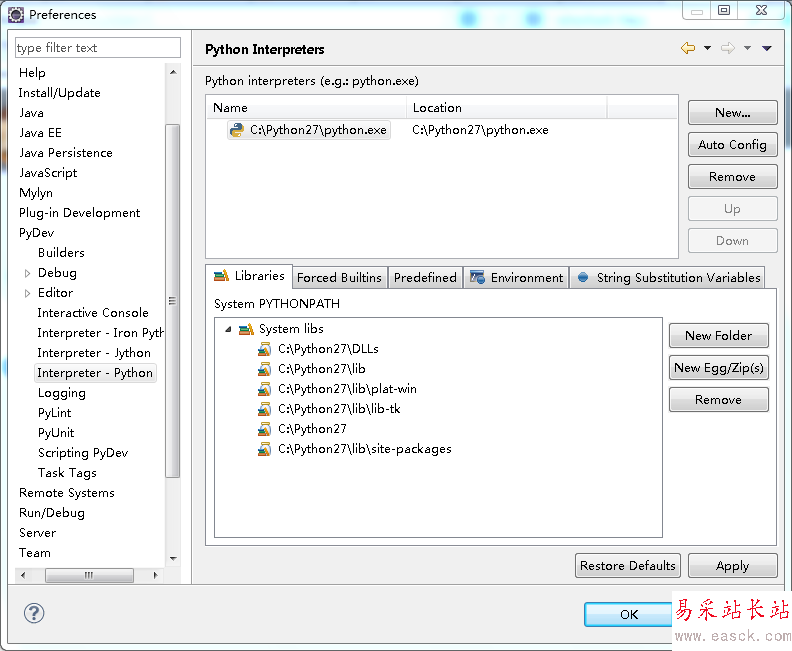 在對話框中,點擊pyDev->Interpreter - Python. 點擊New按鈕, 選擇python.exe的路徑, 打開后顯示出一個包含很多復選框的窗口. 點OK