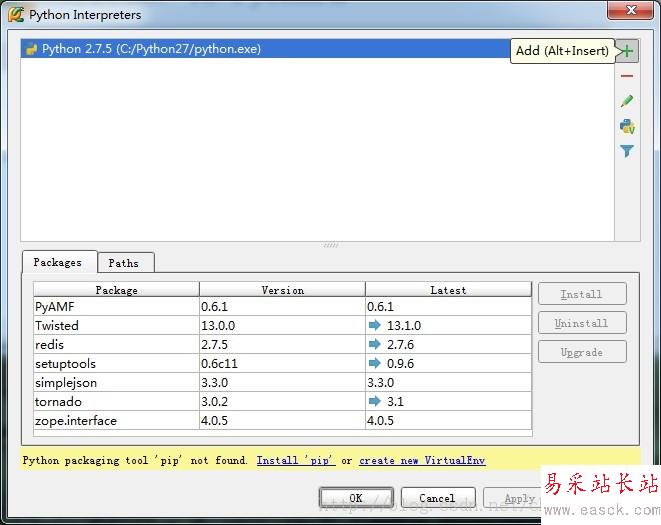 3,選擇python解釋器。可以看到,一旦添加了python解釋器,pycharm就會(huì)掃描出你已經(jīng)安裝的python擴(kuò)展包,和這些擴(kuò)展包的最新版本。(估計(jì)是pycharm連接了pypi)