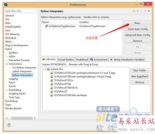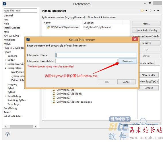 在window --> preferences --> PyDev --> Interpreters - Python Interpreter 中點(diǎn)擊new,然后找到你的python安裝目錄即可。