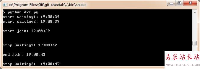 這個小程序使用了兩個線程thread1和thread2,線程執行的動作分別是doWaiting()和doWaiting1(),函數體就是打印「開始」+休眠3秒+打印「結束」,分別附加上時間用來查看程序執行的過程。后面用start()方法同步開始執行兩個線程。然后開始循環調用兩個線程的join()方法,在此之前和之后都會用print函數做好開始結束的標記。我們主要觀察for tt in tsk: tt.join()。