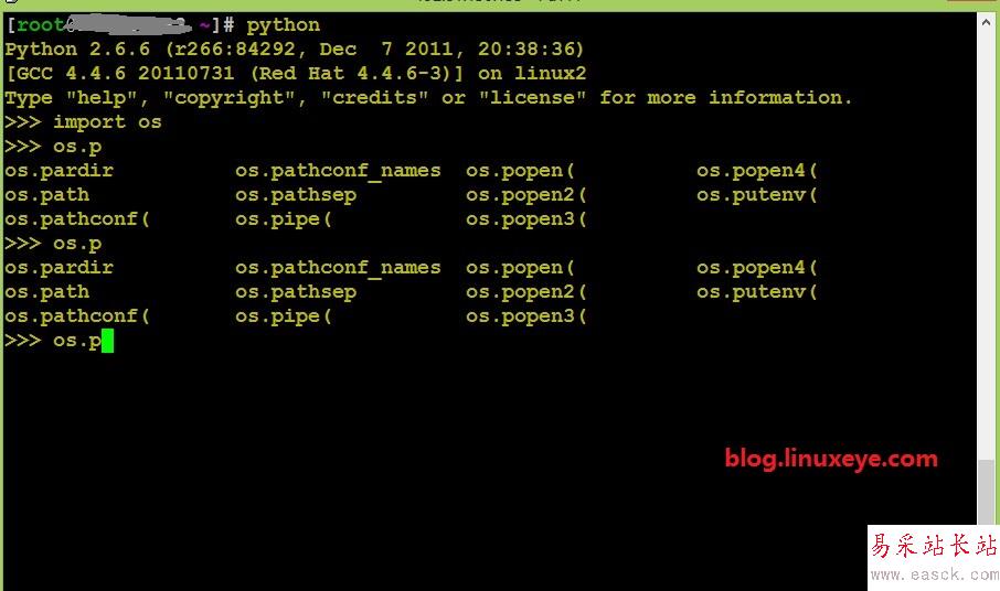 # cat ~/.pythonstartup# python startup file#!/usr/bin/env pythonimport sysimport readlineimport rlcompleterimport atexitimport os# tab completionreadline.parse_and_bind('tab: complete')# history filehistfile = os.path.join(os.environ['HOME'], '.pythonhistory')try: readline.read_history_file(histfile)except IOError: passatexit.register(readline.write_history_file, histfile) del os, histfile, readline, rlcompleter1 echo 'export PYTHONSTARTUP=~/.pythonstartup' >> ~/.bash_profile重新登陸shell,輸入python命令進入交互模式,就可以用Tab鍵進行補全。如下圖:
