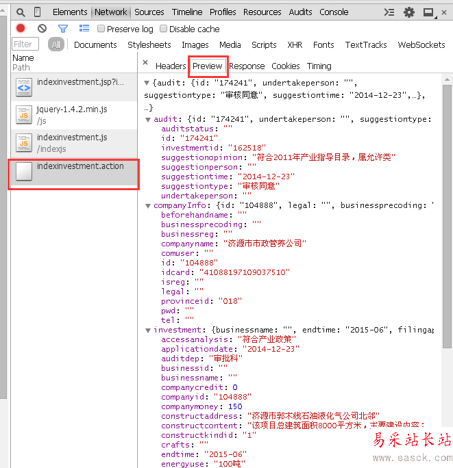 那么,參數(shù)是多少呢?URL上有,是“jsp?id=162518”,問號表示要調(diào)用參數(shù),后面跟的是id號即是被調(diào)用的參數(shù)。而通過對這幾個文件的分析,很顯然,企業(yè)信息存在于“indexinvestment.action”文件中。