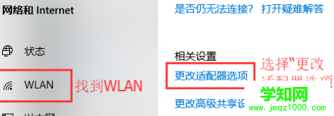 然后找到并點擊”WLAN“選項,在右邊找到“更改適配器選項”并點擊