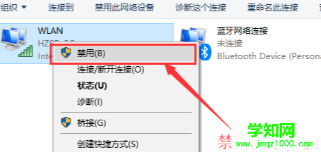 在打開的網絡連接界面中,找到無線連接“WLAN”,右鍵單擊選擇“禁用”