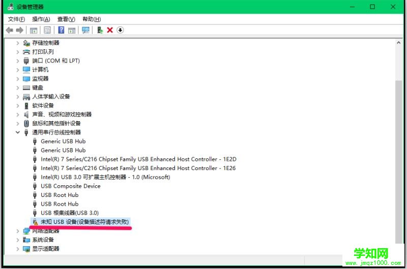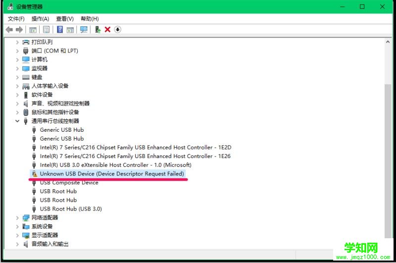 2、進(jìn)入設(shè)備管理器,發(fā)現(xiàn)【通用串行總線控制器】下有一項(xiàng)帶有黃色【!】的Unknown USB Device(Device Descniptor Request Failed)項(xiàng),其屬性中顯示: