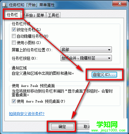 2,點(diǎn)擊“屬性”后會彈出“任務(wù)欄和[開始]菜單屬性”,點(diǎn)擊“任務(wù)欄”--“自定義”--“確定”,如圖2: