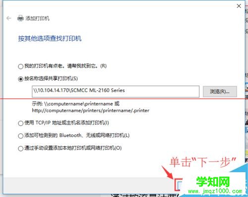 3、這個時候點擊“我需要的打印機不在列表中”它,在彈出的新窗口中,可以看到5個單按鈕。我們選擇第二項“按名稱選擇共享打印機”,并點擊“瀏覽”。不選擇第三項,是因為第三項成功率不高。